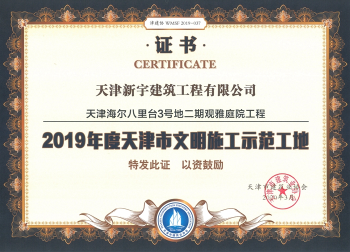 天津海尔八里台3号地二期观雅庭院工程被评为2019年度天津市文明施工示范工地