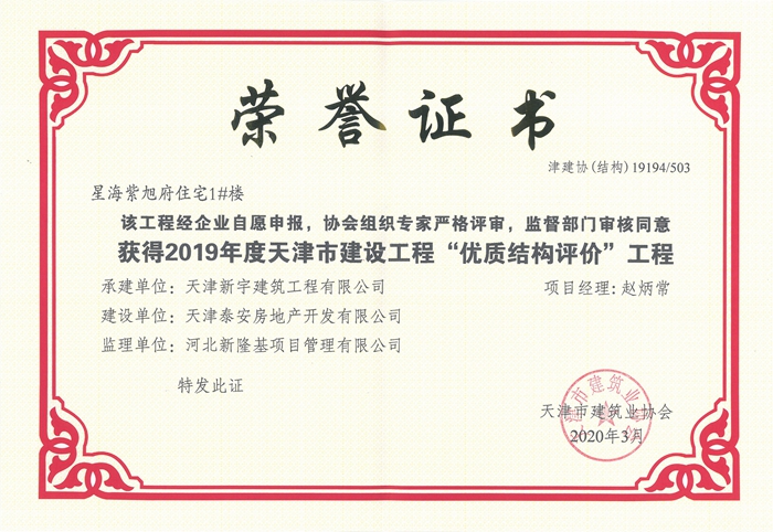 星海紫旭府住宅1#楼获得2019年度天津市建设工程”优质结构评价“工程