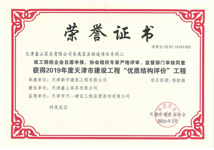 天津鑫山家具有限公司金属家具制造项目车间二获得2019年度天津市建筑工程”优质结构评价“工程