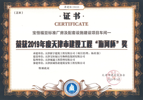 宝恒福豆标准厂房及配套设施建设项目车间一荣获2019年度天津市建设工程“海河杯”奖
