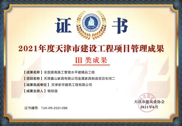 天津鑫山家具有限公司金属家具制造项目车间二荣获2021年度天津市建设工程项目管理成果证书