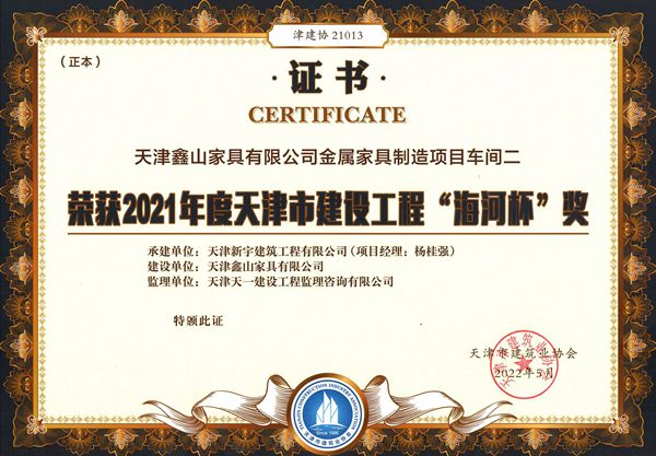 天津鑫山家具有限公司金属家具制造项目车间二荣获2021年度天津市建设工程海河杯奖